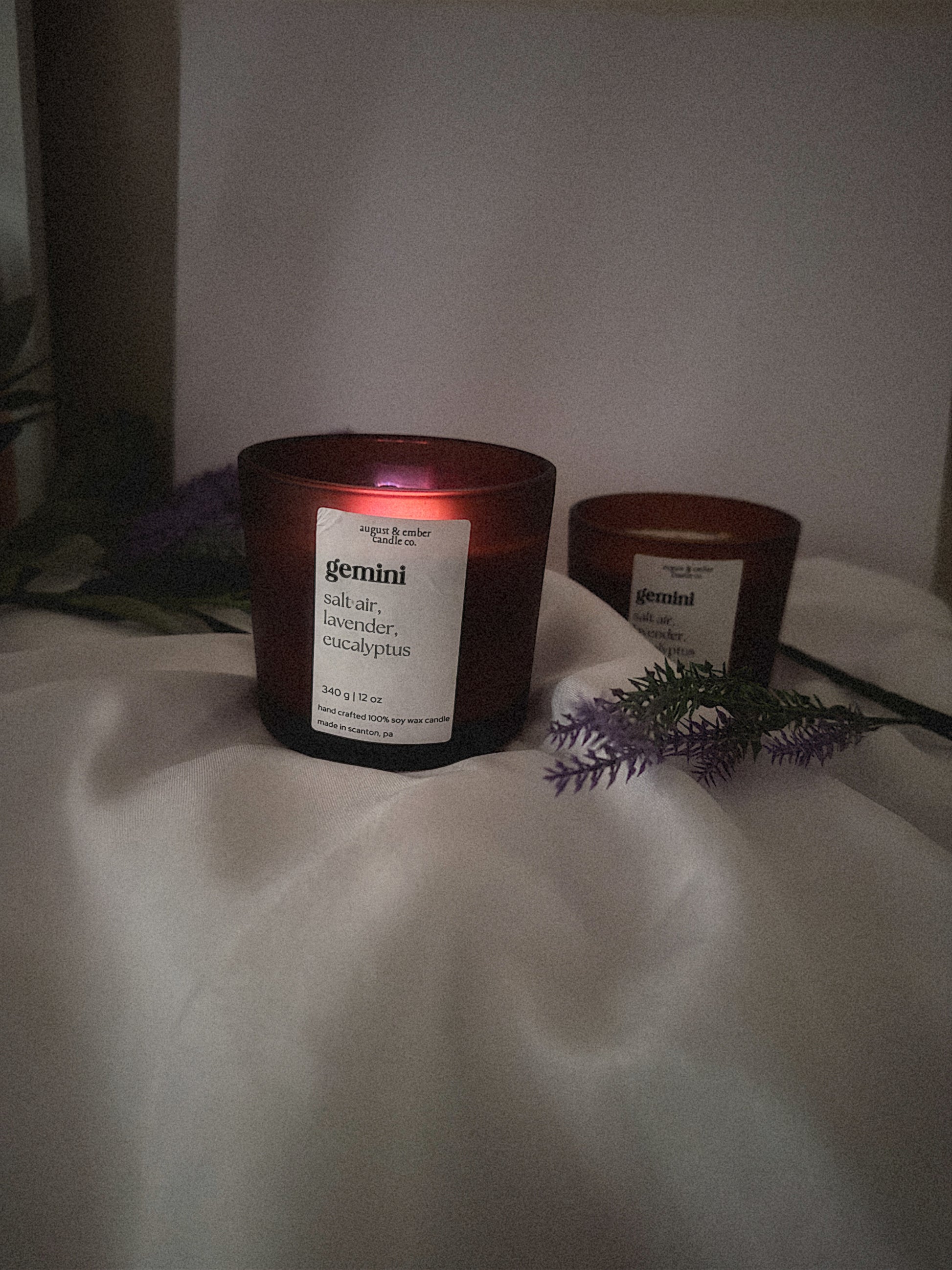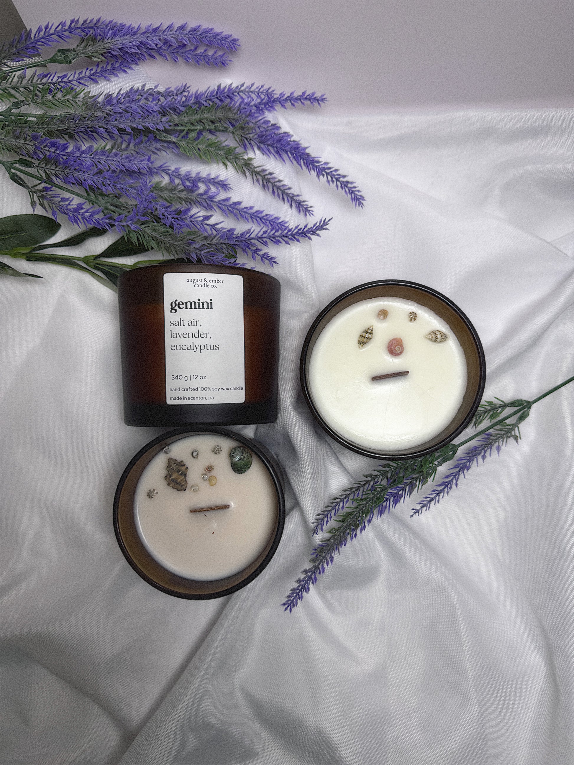 gemini is a calm coastal breeze; with notes of salt air, lavender, driftwood + eucalyptus. topped real sea shells + starfish. wooden wicked.