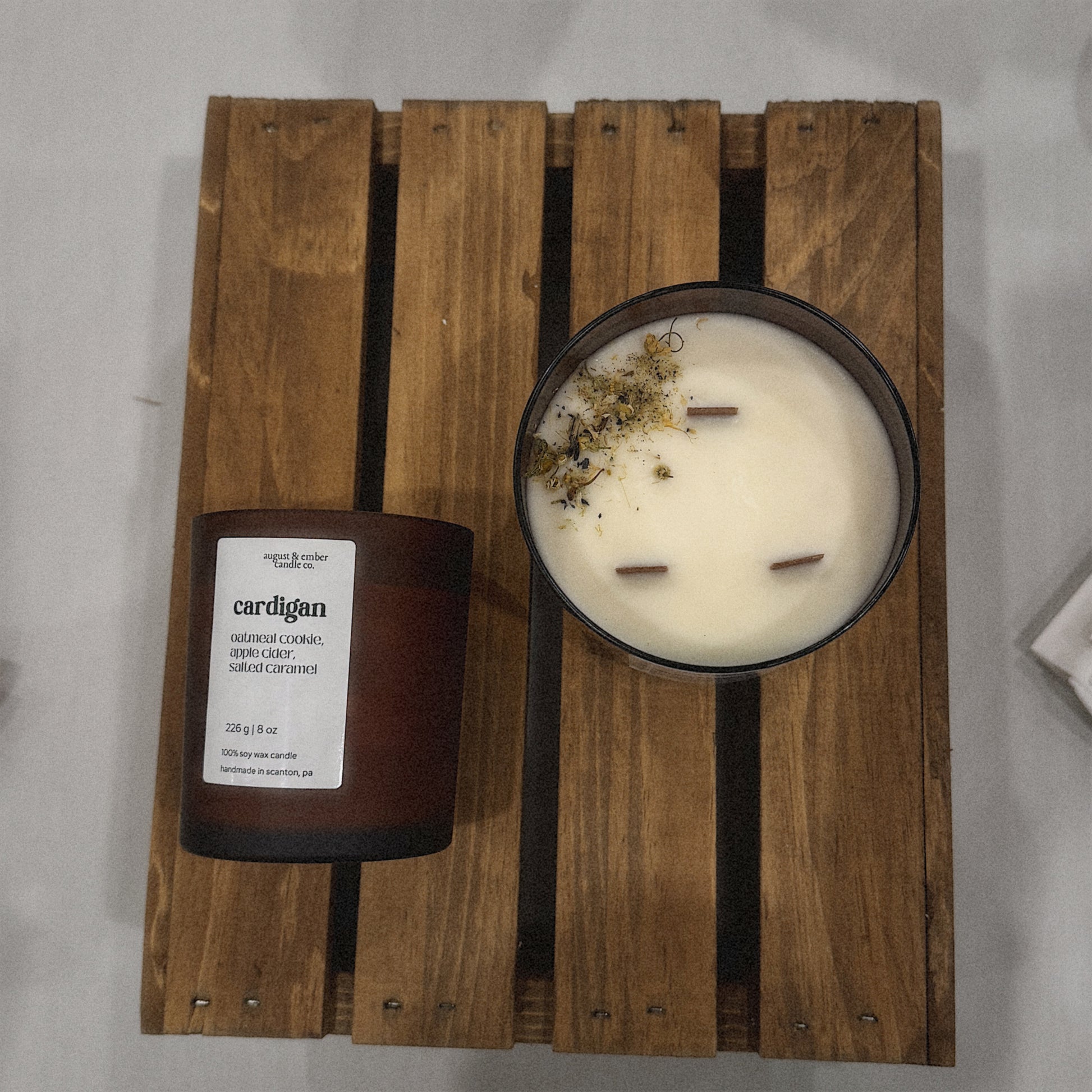 cardigan is a cozy sweet treat; with notes of oatmeal cookie, apple cider + salted caramel. topped with dried chamomile. wooden wicked.