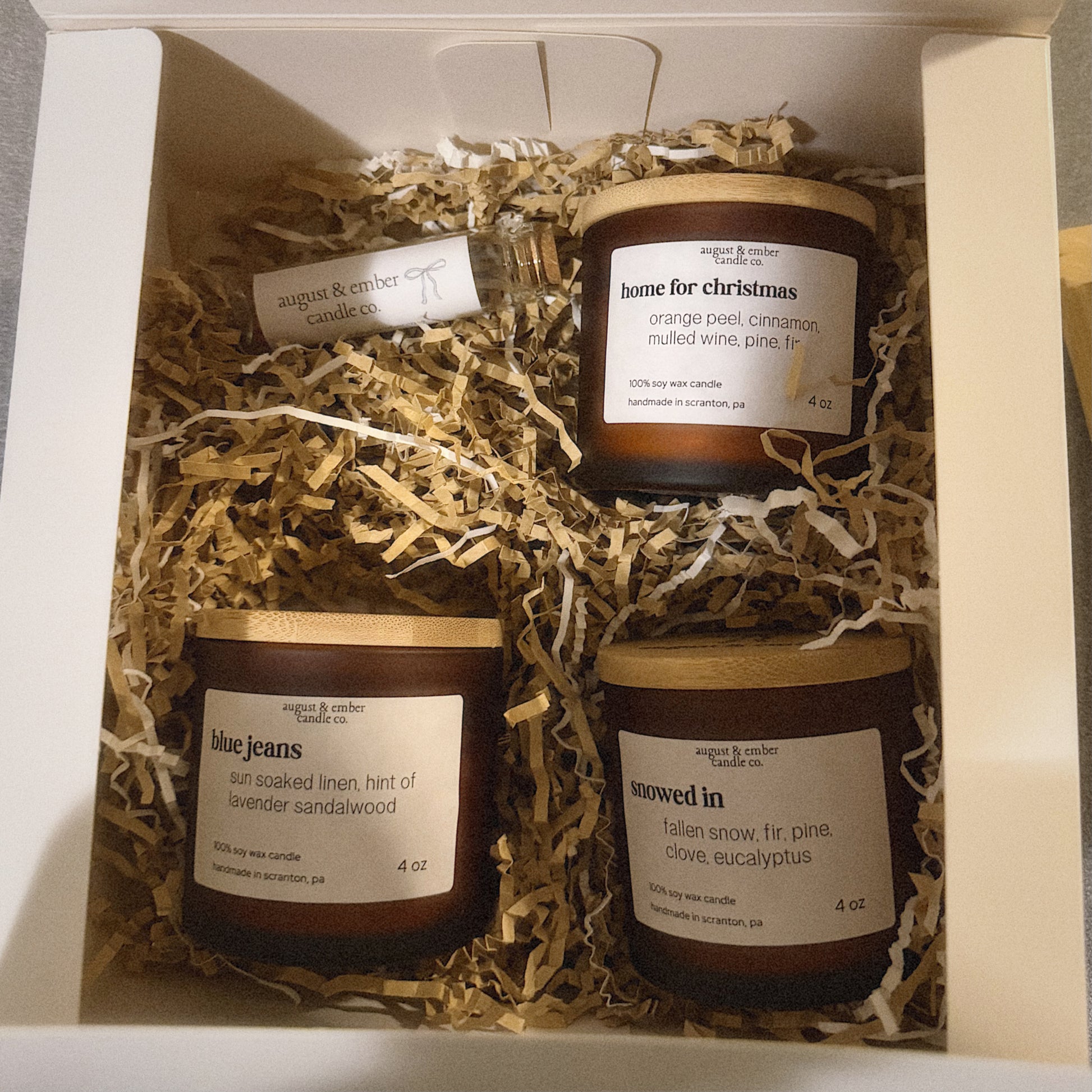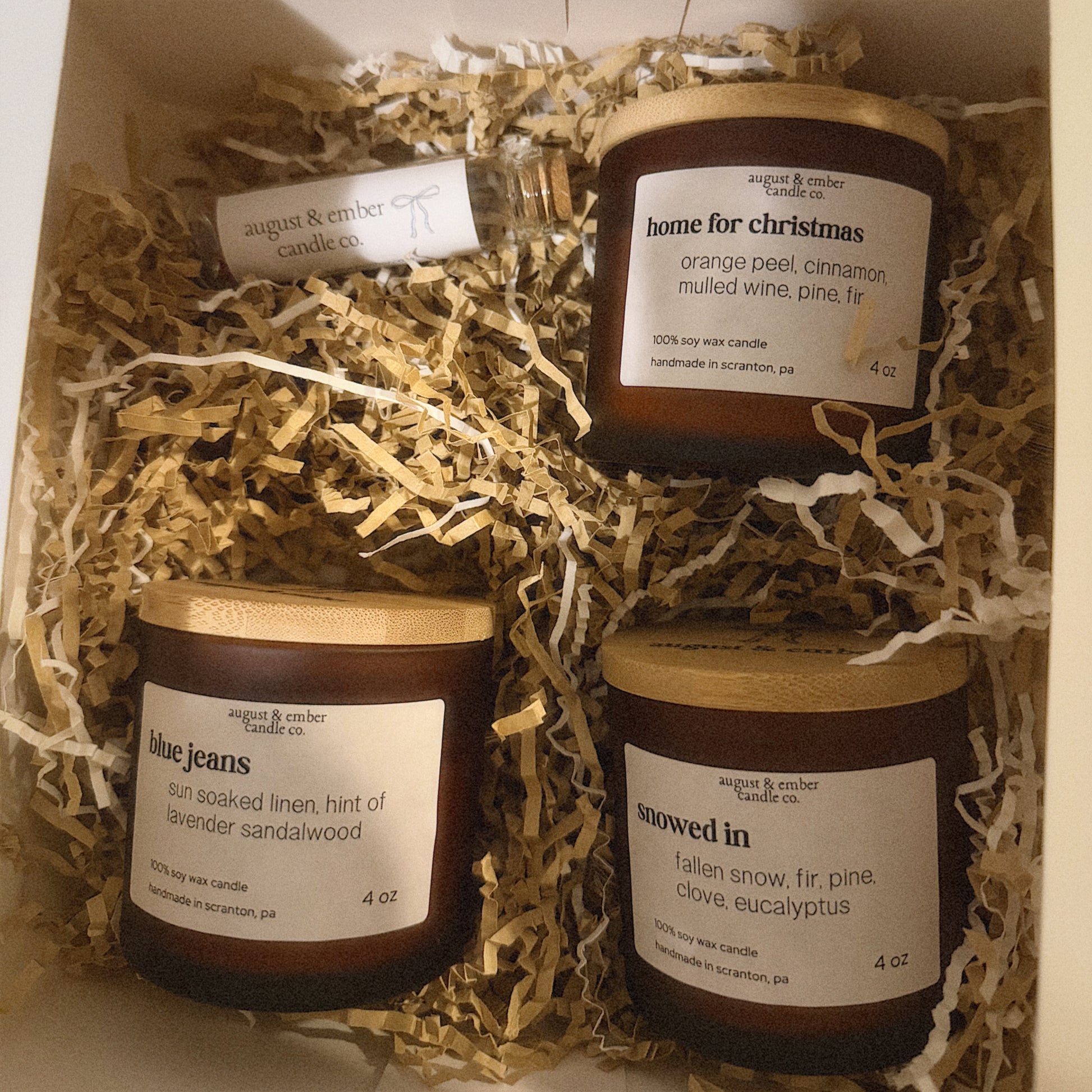 our holiday bundles are the perfect gift! with a 4oz candle of each scent - home for christmas, snowed in + blue jeans and a jar of a&e matches all packaged in a gift box with kraft crinkle paper.