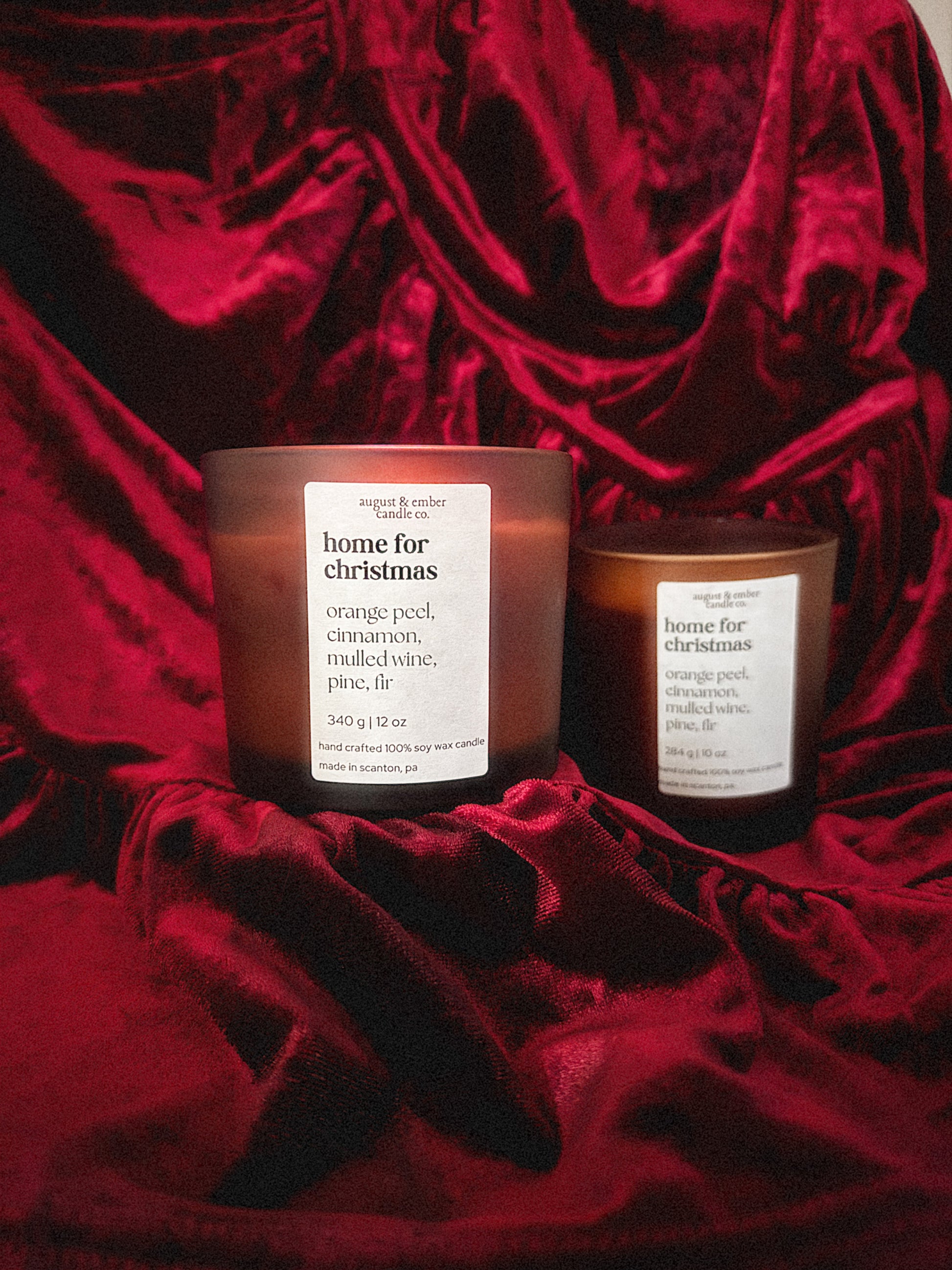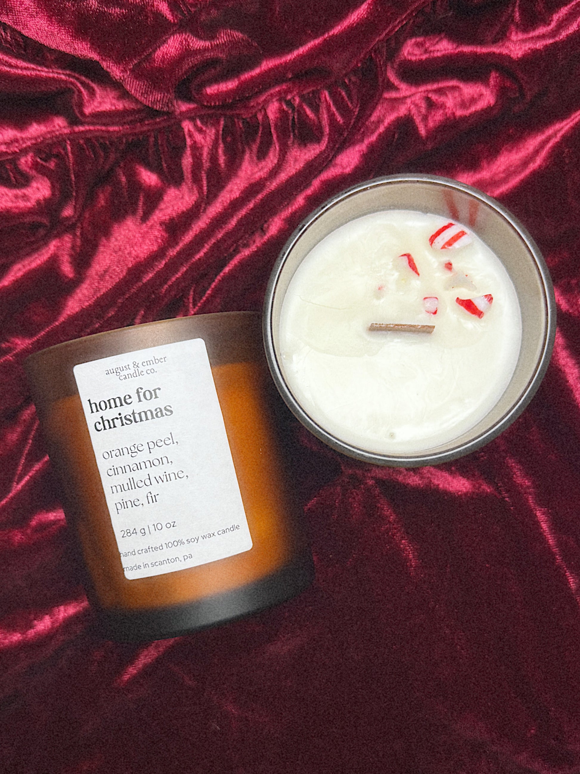 home for christmas is cocktails with family; with notes of orange peel, cinnamon, mulled wine, fir + pine. topped with real peppermint candy. wooden wicked.